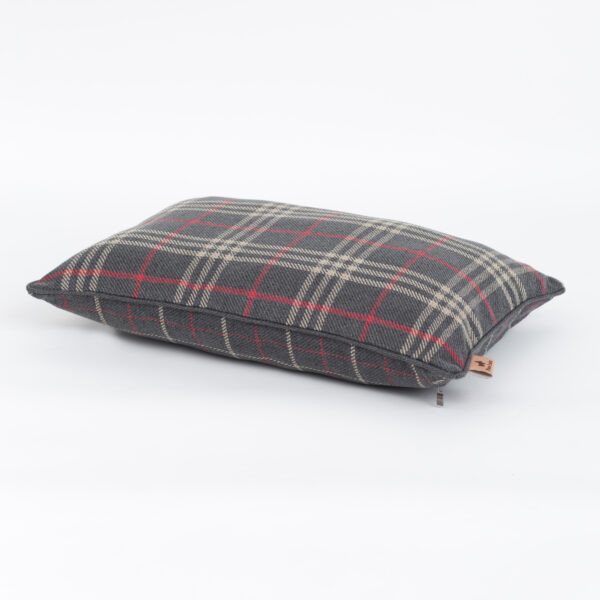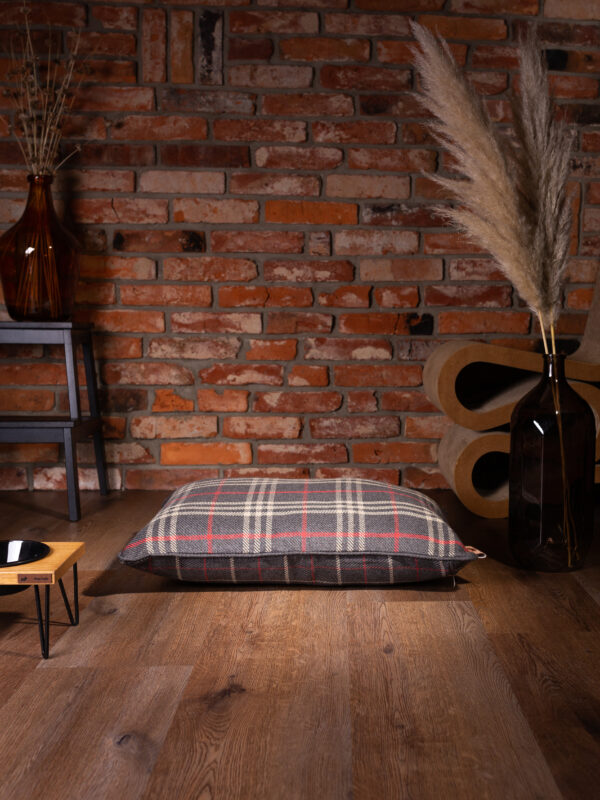 Poducha została pokryta wyjątkowo wytrzymałą tkaniną z polipropylenu, przez co jest odporna na trud psiej eksploatacji. Nie straszne jej psie pazurki, drapanie ani zamiłowanie do podgryzania. Utrzymana w głębokim odcieniu antracytu i wzbogacona o czerwone akcenty prezentuje się nad wyraz gustownie. Całość uzupełnia pleciona struktura.